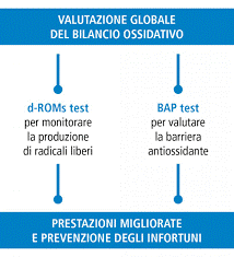- d-ROMs TEST invece va a misurare la presenza dei radicali liberi. Il sangue prelevato interagisce con una soluzione producendo una reazione e una conseguente colorazione che viene misurata tramite spettrofotometro valutando cosi' i metaboliti reattivi dell’ossigeno nel sangue